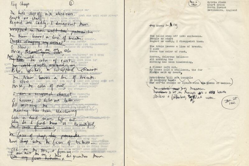 "Fog Sheep" as it was first known, started life December 2, 1962. Despite the stricken "dolorous" atmosphere, the penultimate stanza hankers for spring: "My bones hold a stillness, the far/Fields melt my heart..." The drafts show Plath trying to finish with images of fatherly clouds, floating across the landscape, "Patriarchs till now immobile... Row off as stones or clouds with the faces of babies." But on January 28, on a typed draft, the final stanza is crossed out and replaced, with no hope for spring remaining. The thaw of the fields becomes a flood of treacherous water: "They threaten to let me through to a heaven, starless, and fatherless, a dark water." Two weeks later, Plath was dead. To sit and leaf through these pages, looking at Plath's exuberant, round, almost student-like writing, is to shiver at the story they tell.