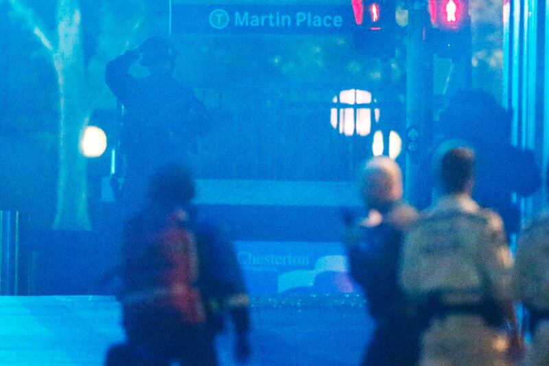 A heavily armed police officer gestures near the Lindt Cafe during the hostage crisis.