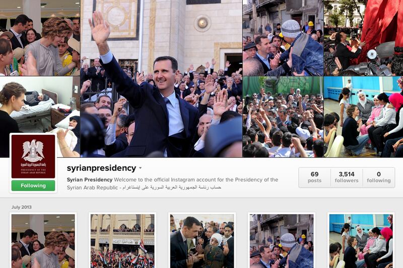 Maybe the low traffic is because the Assad site is nothing to retweet or re-Instagram about—or maybe Internet access in Syria is slow. Instead of commanding the propaganda “space,” the argot that user-experience folks are fond of using, Assad’s Instagrams are insta-clichés, standard photo-ops of meet-and-greets that are routine on every kind of politicians’ social-media platforms in the United States and throughout the world. One of the downsides of the online universe is the wholesale homogenization of just about everything that has a national character; still, I was surprised to see how the Web has enabled Assad’s people to flatline the art and experience of propaganda. Anyone following Assad’s Instagrams are in for a shock—or rather a snooze. Instead of finding startling heroic posters showing Assad leading troops into battle against Syria’s ragtag rebels, the primary photo on the landing page is the president shuffling papers at his desk looking like a forlorn H&R Block representative in August. For variety’s sake, however, he is also shown shaking hands with soldiers, dignitaries, and citizens and comforting some supporters. The poses are not even as interesting as most stock shots. As an alternative, there are many apparently “candid” photos of the president’s attractive English-born wife, Asma (al-Akhras) al-Assad, greeting, meeting, and eating with Syrians, which is clearly an attempt to present life as usual, even as air attacks, chemical weapons, and rockets violently destroy lives on both sides. These Instagram images fail to heroicize but they try to normalize—even humanize.