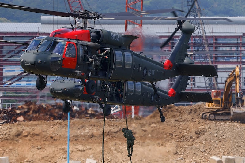 A soldier rappels down a Black Hawk helicopter during a drill rehearsal in New Taipei City, Taiwan on July 20, 2023.