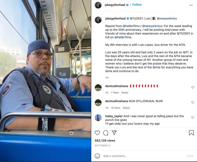 Take this post of Gyllenhaal’s from September 11 of this year, wherein the actor paid tribute to a bus driver for the MTA who was working on 9/11: