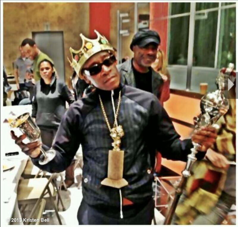 Actress Kristen Bell posted a photo on her WhoSay account of her House of Lies costar Don Cheadle celebrating his Golden Globe win for Best Actor in a Comedy Series. Complete with his crown, scepter, and statue hanging from his neck, Cheadle looks like “a boss.”