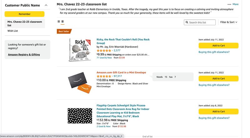 “I am the STEM teacher for Robb Elementary school,” one educator’s Amazon Wish List reads. “...This year, because of the tragedy in my building, I was displaced. I at the moment, do not have my class materials, and I still do not know where my class will be at my temporary school. I am creating this list to provide the best learning environment for my kids… Please help me continue giving them the education they deserve.”