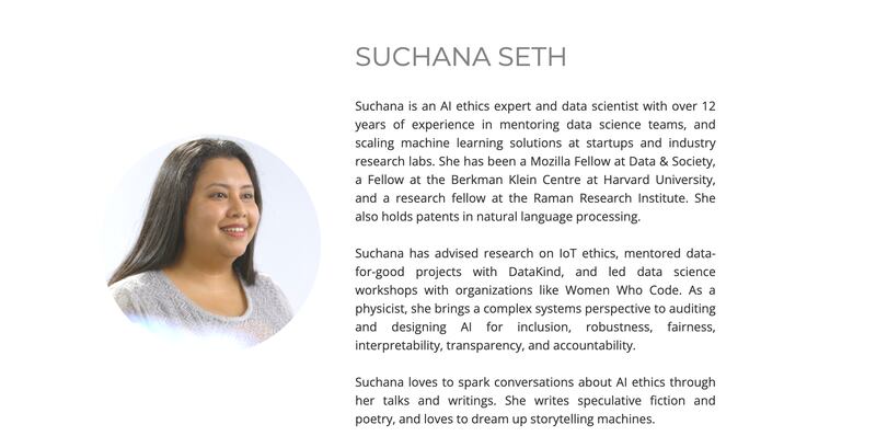 Suchana Seth’s biography page on the website of her startup AI company.
