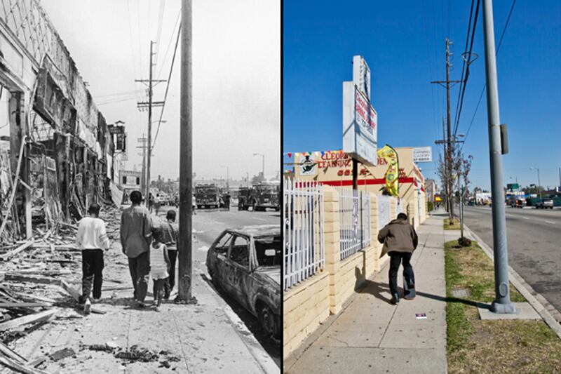 My 20-year retrospective project actually started on the first anniversary of the rioting. Then I did a five-year, followed by a 10-year follow up. The 20-year project was the difficult to complete due to remembering where the original photos were taken—most were taken quickly and on the fly. I wanted 10 original scenes to be re-photographed as close to original or in the same theme as possible, for a total of 20 images, one for every year.