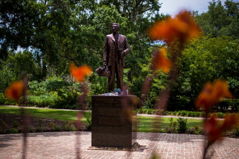 The struggle to reframe Vesey is emblematic of the broader fight to address the legacy of slavery across Charleston, where until just two years ago, one of the institution’s most ardent supporters, John C. Calhoun, stood tall in the city’s center. The Citadel, located near Vesey’s statue, still plays “Dixie” at football games as fans wave Confederate flags.