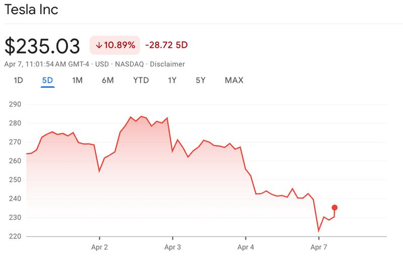 Elon Musk’s company’s shares dropped 10 per cent in early trading on Monday, leveling out at $214.80 down from $235.86 when Lutnick made his remarks.