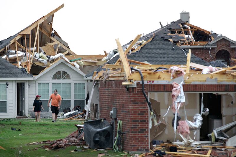 People walk through tornado damaged homes in the Diamond Creek subdivision in Forney.