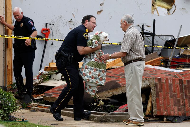 Arlington police officer Rick Stewart (left) and Tarrant County constable Clint C. Burgess (center) rescue a dog that belongs to David Lowe's (right) daughter after a tornado destroyed their home.