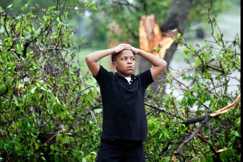 Ten-year-old Ty Proctor surveys damage after a tornado struck Bradley Lane in Arlington. Ty's dog, a red doberman, is still missing.