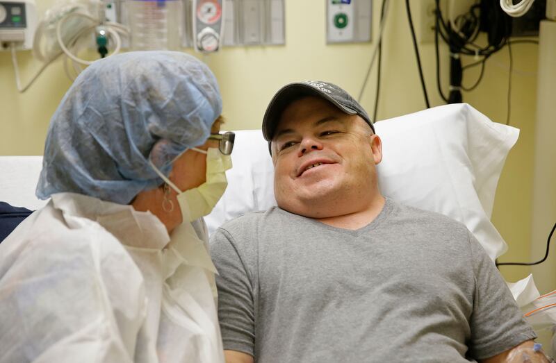 Brian Madeux sits with his girlfriend Marcie Humphrey while waiting to receive the first human gene editing therapy at the UCSF Benioff Children's Hospital in Oakland, Calif. Madeux, who has Hunter syndrome, received the treatment on Monday, Nov. 13.