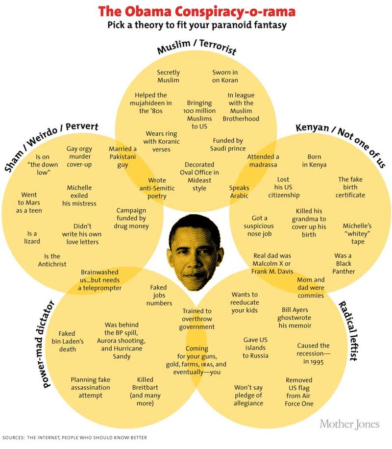 Anyway, for more riveting theories about President Obama, below is a diagram I helped make for Mother Jones magazine in 2012 that charts nearly every single Obama-related conspiracy theory ever. (You can check out the full breakdown here.)
