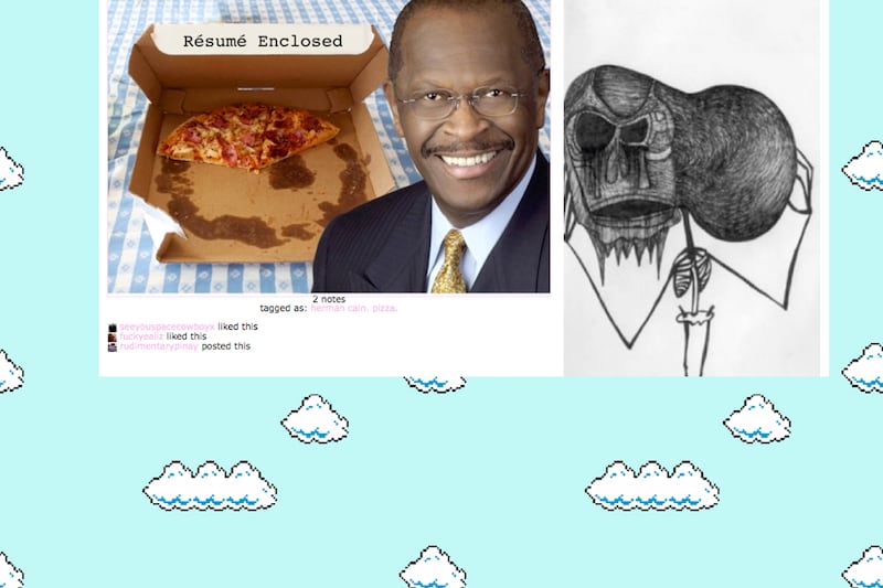Cain’s pizza past has been meme gold on Tumblrs across the web. This one pokes fun at his lack of political experience, suggesting that perhaps Cain submitted a box of pizza as his presidential resume.