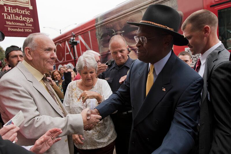 As political talk-show host Bill Maher announced earlier this week, “Only Herman Cain can pull of the pimp hat with a mustache combo while running for president.” It must be his Southern style, but for some reason Georgia-raised Cain can rock the look like no other GOP candidates has … or should. (Looking at you, Michele Bachmann.)