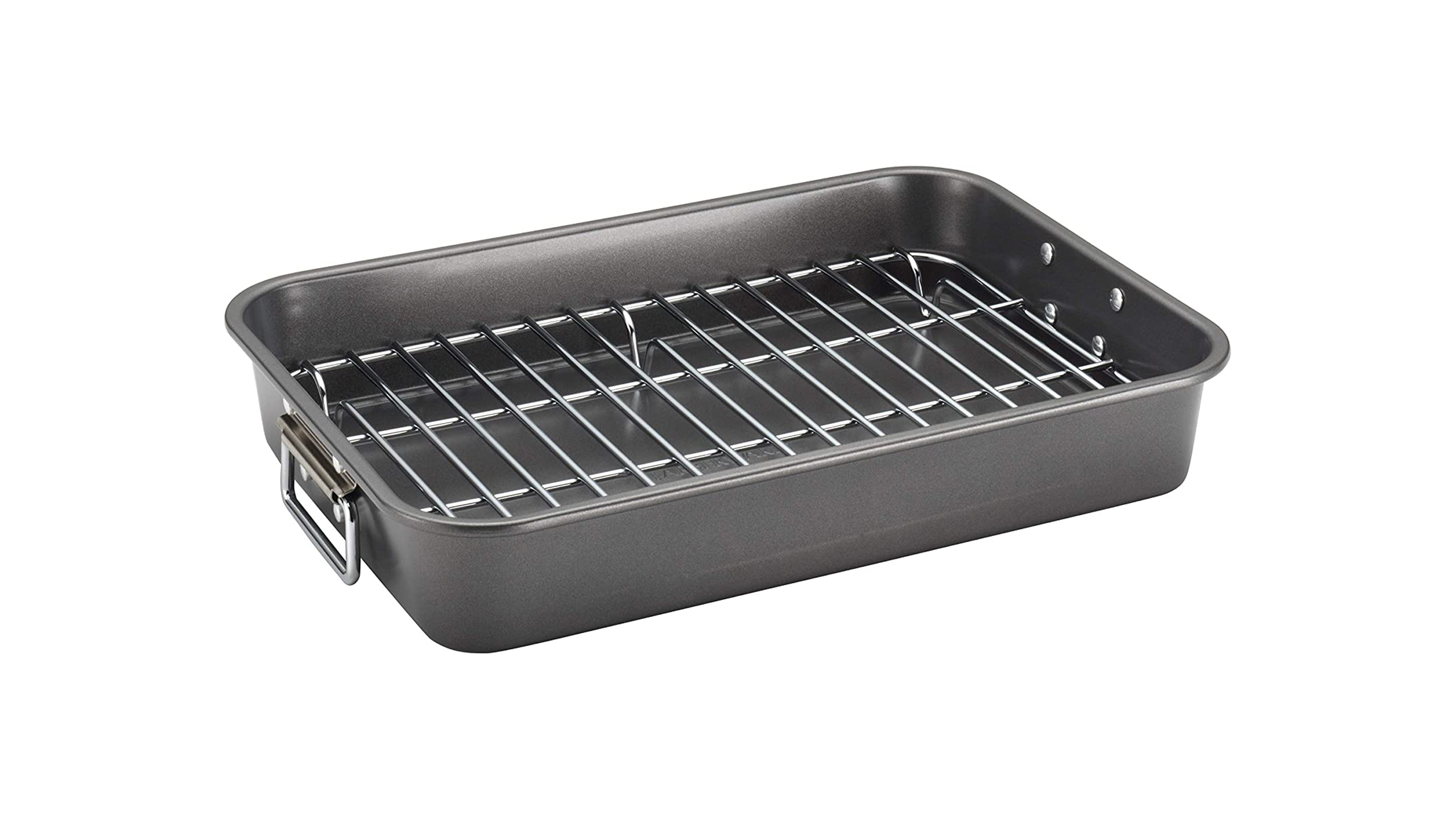 This nonstick roasting pan delivers great food release with mess free cleanup. Because it’s nonstick you also can use less oil, which is always a plus. It also has some nice handles on the side that makes it comfortable to carry to and from the broiler.