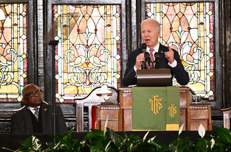 President Joe Biden speaks while Rep. James Clyburn (D-S.C.) listens, at the historic Mother Emanuel AME Church on Jan. 8, 2024 in Charleston, S.C.
