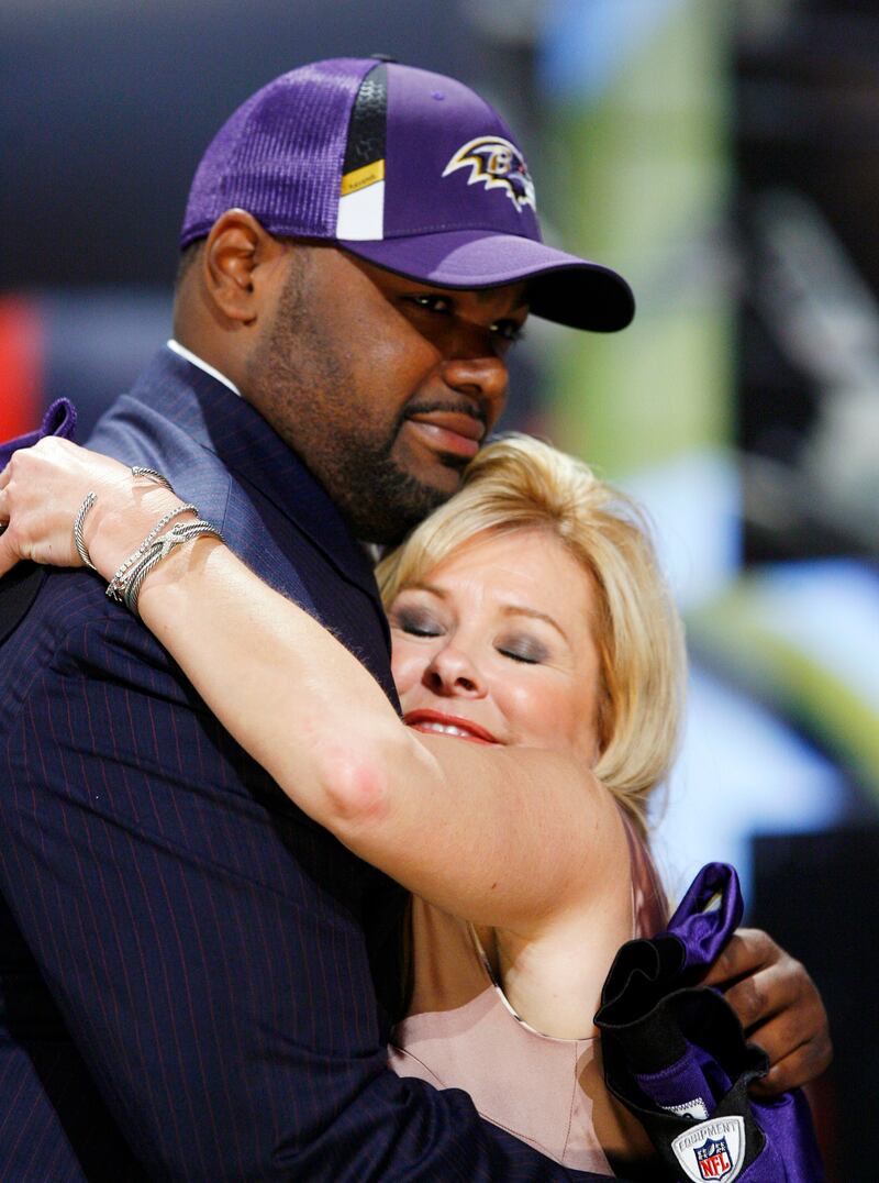 Michael Oher embraces Leigh Anne Tuohy shortly after being selected by the Baltimore Ravens in the 2009 NFL Draft.