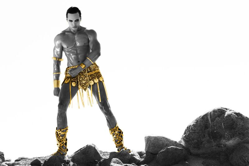 The next time we see him, Kuba has swapped out the spiked underwear for red undies that have a definite Sean Connery-in-Zardoz flavor, and he’s being wired up for a stage show that will see him levitating above a collection of scantily clad dancers.