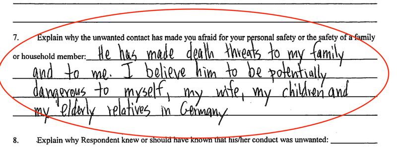 In a 2012 Petition for a Stalking Protective Order filed in Clackamas County, Ore., The Baron expressed concern that William Sikkens was dangerous.