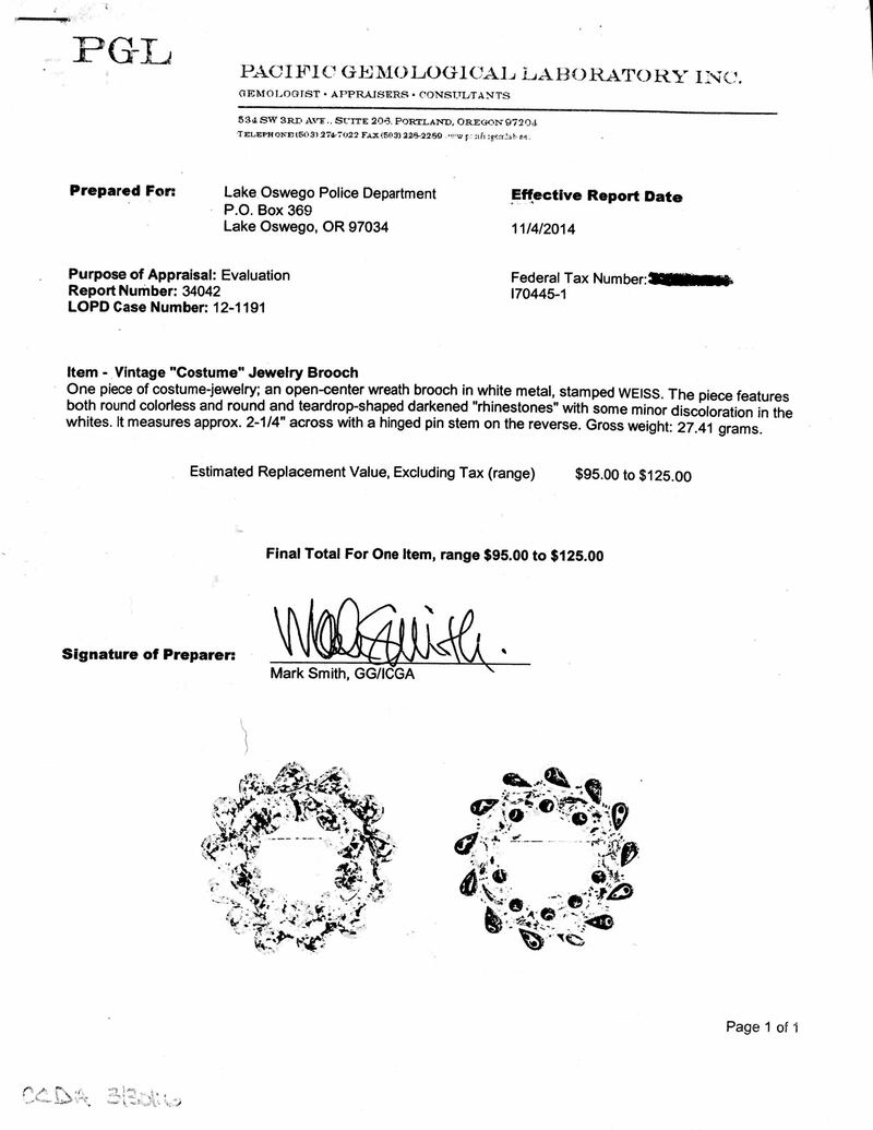 When he first called a reporter, the Baron claimed that Taylor and his sidekick Mourey were just fall guys. Detective Ferguson and other Lake Oswego Police officers were the real villains. “[T]hey broke into my wife’s locked safe, which wasn’t part of the robbery, took somewhere around $45 and $60 million in rubies and sapphires and emeralds…” Paperwork filed by the Baron’s lawyer claims that this lost loot, now valued between $180 million and $250 million, included: an Annette v. Droste hair necklace, a Crown medal, a von Bothmer portrait painted on ivory on a pearl necklace, a stack of Revolutionary War-era bills, a Droste Hulsolf lapel pin, an Invicta watch, original manuscripts from the Grimm Brothers, cash, tiaras, jade statues, and two signed copies of Mein Kampf.