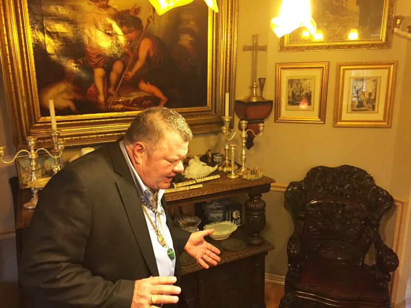 Before taking a seat in his crowded living room, the Baron gave a brief tour, pointing out replica artwork, shrunken monkey skulls, and the makeshift chapel in a corner of the reading room. When it was finally time for an interview, the Baron and Baroness brought out a large binder full of newspaper clippings, printed-out emails, and other documents; proof.