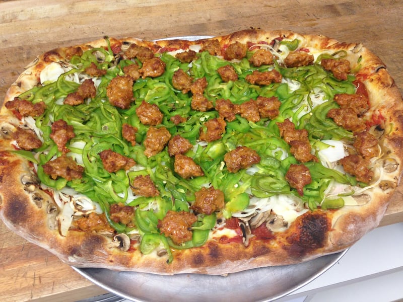 The other toppings are equally extreme. If you order sausage, you won’t get that ground-up spattering of meat common to New York pies. You’ll get sausage chunks nearly the size of ping-pong balls. I have video of Vincent’s Dave Miller making a seven-topping pizza. When it goes into the oven, the toppings are piled about four inches high. It takes long seconds of effort for Miller to extract his giant wooden spatula from beneath the uber-pie.