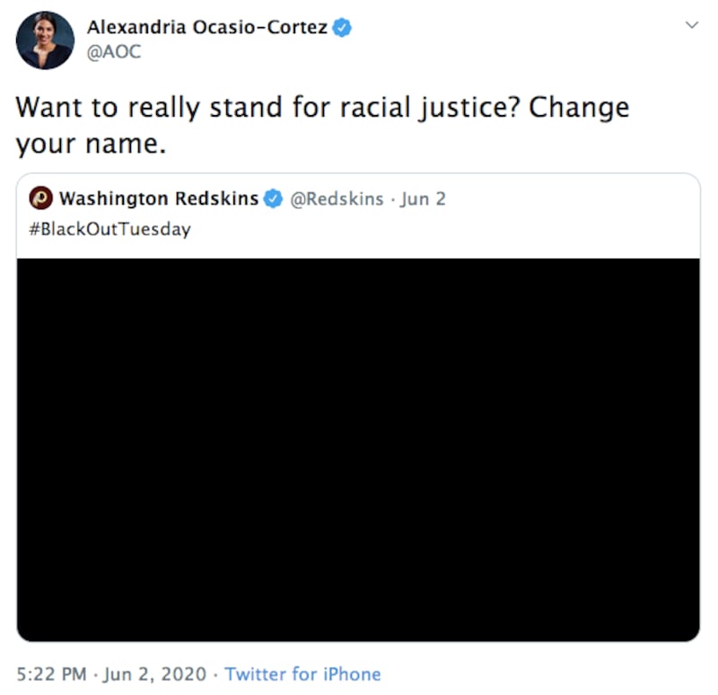 If that weren’t enough, the Washington Redskins tweeted a black square Tuesday morning, echoing the widely despised social media campaign “Blackout Tuesday,” which Black organizers claimed drowned out useful information about protests. U.S. House Rep. Alexandria Ocasio-Cortez (D-NY) responded, “Want to really stand for racial justice? Change your name.”