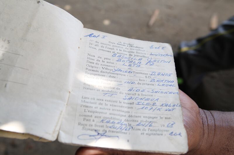 Basosila Botala is wearing a blue rain jacket despite the sweltering heat. The cheery 69-year-old father of eight sits in the center with his wife and delicately brandishes a small, brown book. “Livret de Travail” is printed on the frayed tan cover: it’s the workbook he used as an employee on the Belgian plantations that covered the island.
