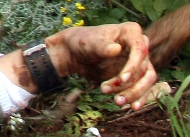 On closer examination, this is not the hand of a supine victim. The intermediate and distal phalanges of the index finger show contraction, as if the Palestinian Arab were squeezing something.