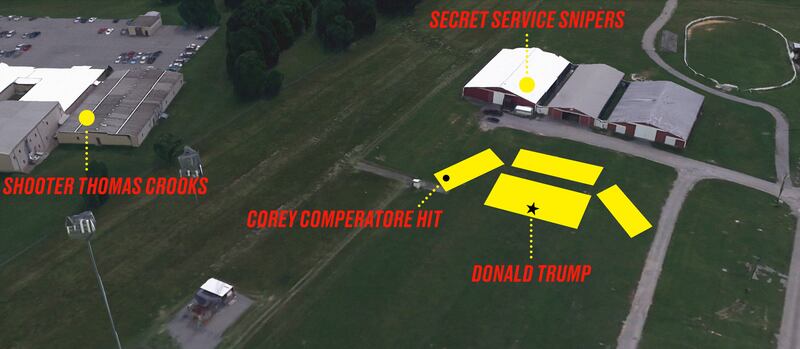 The Daily Beast/Google EarthThings were bad from the jump for those tasked with protecting the former president. His rally was just outside Butler, a town of 13,000, and was in a mostly-open field with only a handful of buildings inside and outside the event’s official perimeter.