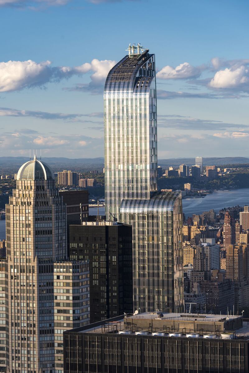 New York landmarks and attractions: One57 building with its characteristic curved top as seen from the Rock Observation Deck. One57, formerly known as Carnegie 57 is a supertall skyscraper in the Midtown neighborhood of Manhattan, New York City.