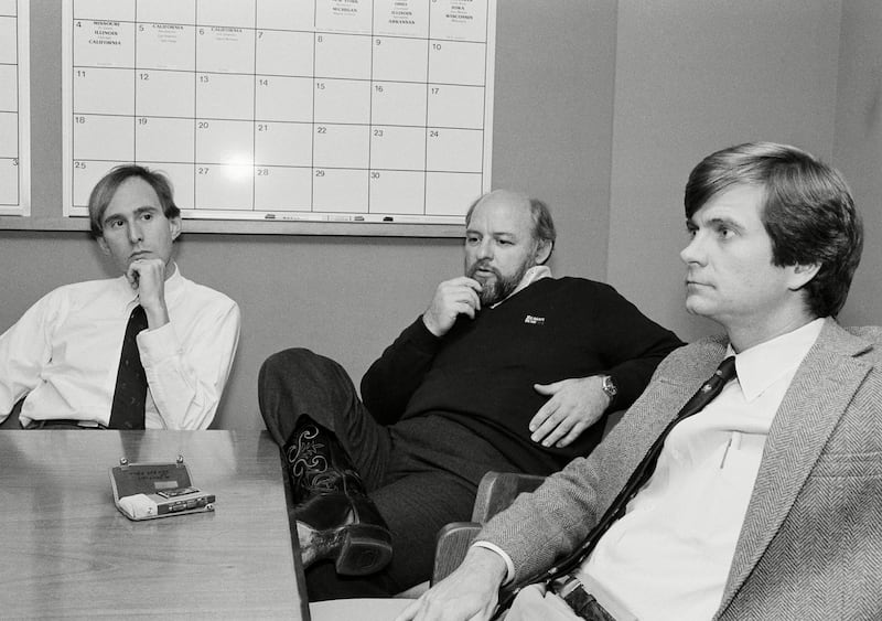 President Reagan's campaign operatives, Roger Stone, left, Ed Rollins and Lee Atwater, right, discuss the meeting they had during the president's re-election campaign with former president Richard Nixon in Washington, 1984.