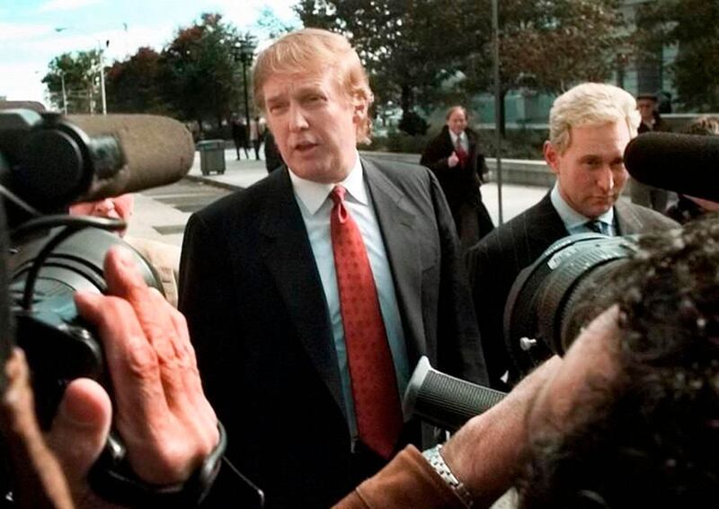 Real estate developer Donald Trump, left, is seen outside the Federal Courthouse in Newark, N.J., with Roger Stone, the director of Trump's presidential exploratory committee, for the swearing-in of Trump's sister as a federal appeals court judge. In a prelude to his possible presidential bid, Trump quit the Republican Party Monday and joined New York's wing of the Reform Party setting the stage for a possible presidential nomination battle with Pat Buchanan Oct 5, 1999.