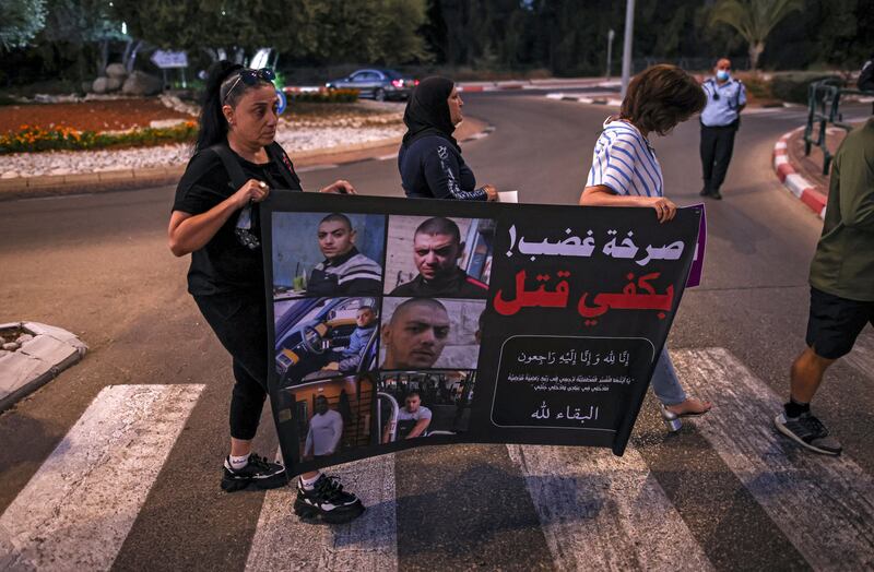 Women demonstrators cross a street with a banner showing the faces of victims and text in Arabic reading "cry of anger, enough killing" during a protest by Arab Israelis and activists against the government's insufficient action towards rising violence levels within the Arab community, outside the home of Public Security Minister Omer Bar-Lev in the northern Israeli town of Kokhav Yair on September 25, 2021.