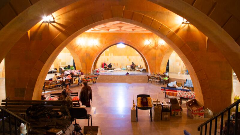 Because of artillery fire, the local population, who remained in Stepanakert, are forced to stay in a shelter. They now live in basements such as this one under a church.