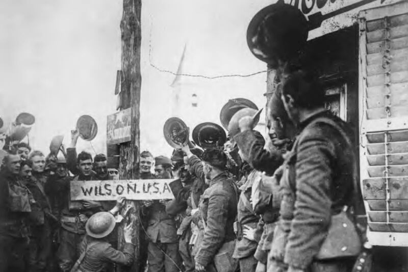 Victorious American troops replace a German street sign with their own versionm St. Mihiel Salient, France, September 1918. Unknown photographer, U.S. Army Signal Corps. Courtesy of IWM
