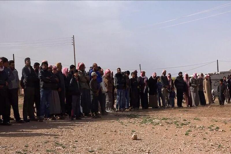 The set of four still photographs shows two blindfolded men standing side-by-side in a desert clearing on the outskirts of an unnamed town while a group of Islamic State partisans and supporters, some leaning on motorbikes, gather to watch the killing. One victim with curly hair, a beard and wearing a gray leather jacket seems to accept his fate as a killer rests his hand on his shoulder.