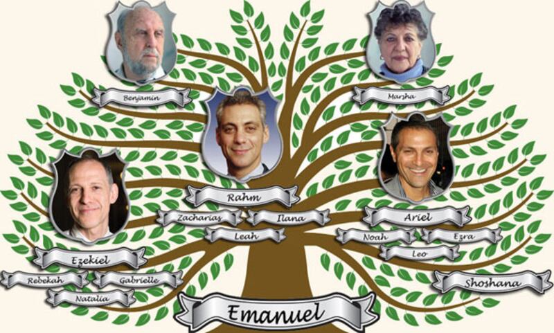 The parents—essentially Jewish versions of Joseph Kennedy and his wife Rose Fitzgerald—were bright and caring, driven but indulgent of their children’s creative whims, according to Rahm biographer Naftali Bendavid. When Ari—the youngest, future founder of the Endeavor talent agency, and model for Ari Gold on HBO’s Entourage—wanted to build an igloo with his brothers, Marsha gave over all her pots and pans for freezing blocks of ice. When Rahm—the middle child, future engineer of the Democrats’ 2006 takeover of Congress and President Obama’s chief of staff—wanted to get serious about ballet, Marsha drove him to class. When Zeke—the eldest, future bioethicist at the National Institutes of Health and leading voice for health-care reform—wanted to dissect cow parts, he got cow parts. (The Emanuels also adopted a daughter Shoshana, who now has children of her own, and who has a complex relationship with the rest of the family.)