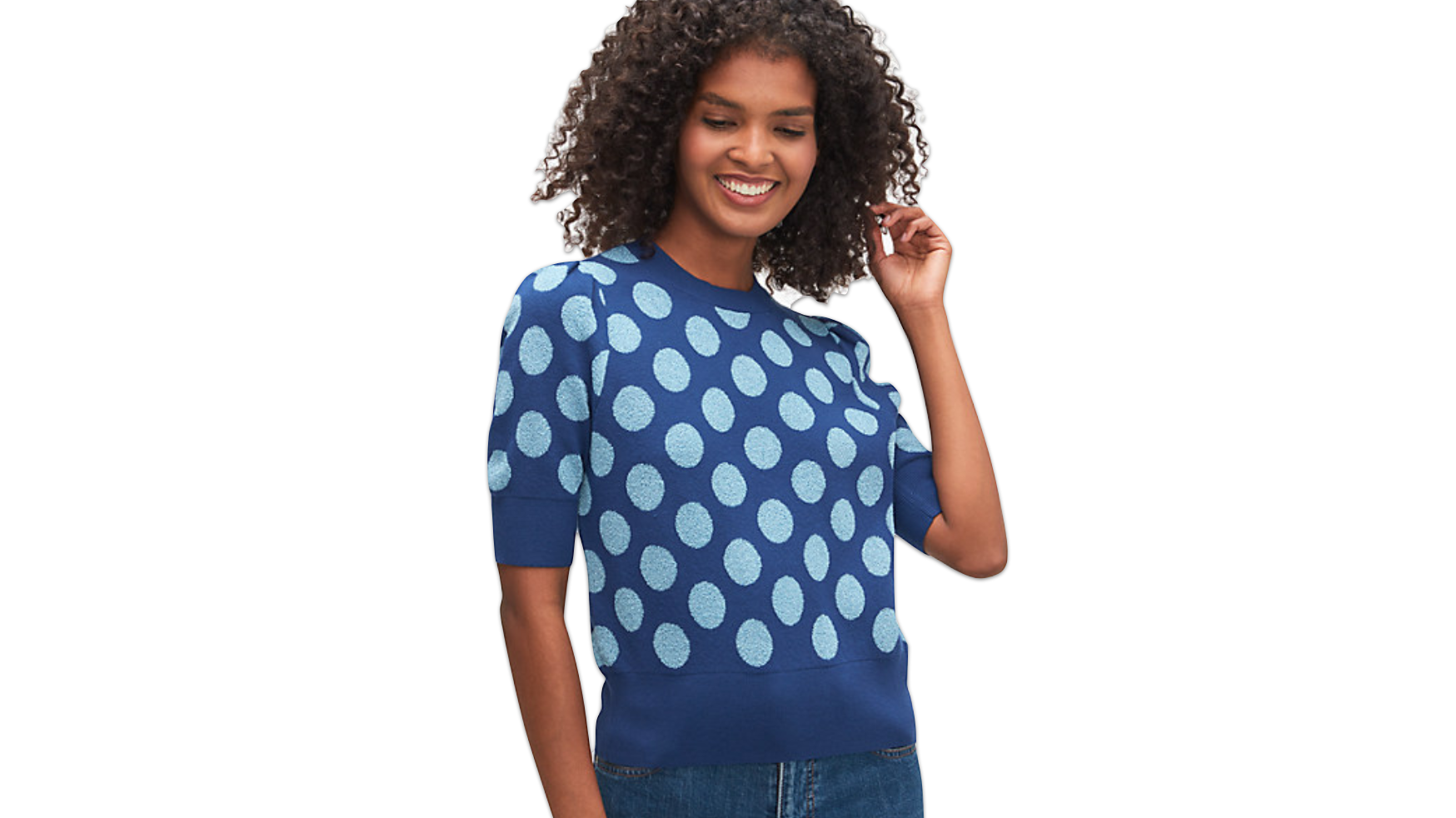 Excited about sweater weather? Pick up this beautiful blue polka dot sweater for only $69 (74% off the original price)! It's cozy, lightweight, and will look good with almost anything in your closet.