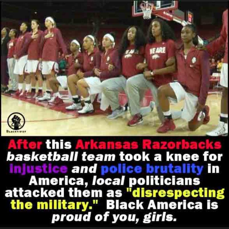 The Russian propaganda group backed kneeling during national anthems as far back as June of last year, when it commended the Arkansas Razorbacks’ women’s program for taking “a knee for injustice and political brutality in America” in a meme.