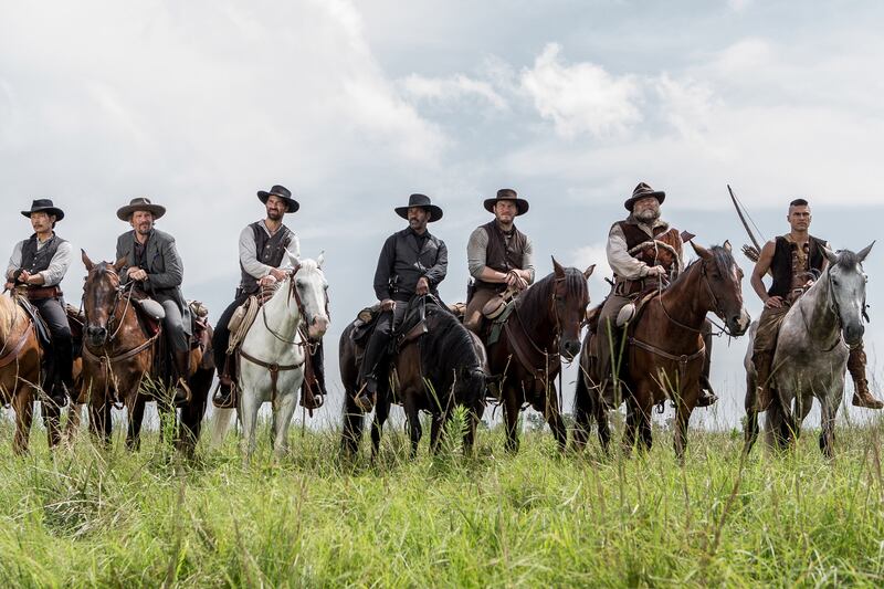 This retelling hinges on a familiar plot: Seven ragtag gunslingers rally to help a town fend off a murderous robber baron, putting their selfish lives on the line for the greater good. But Fuqua also puts his intentions front and center by opening on Washington’s slow horsebound amble into a new town, staring down the glares of white denizens who don’t bother hiding their disdain, disbelief, and open hostility for the black cowboy standing before them.