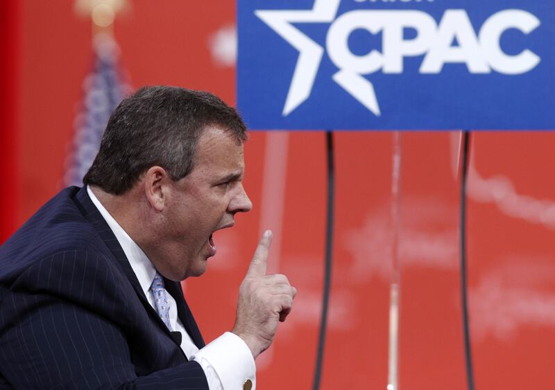 New Jersey Governor Chris Christie speaks while being interviewed onstage.
