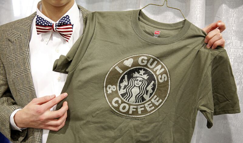 A man holds up a gun-rights shirt that plays off the Starbucks logo in the exhibition hall.