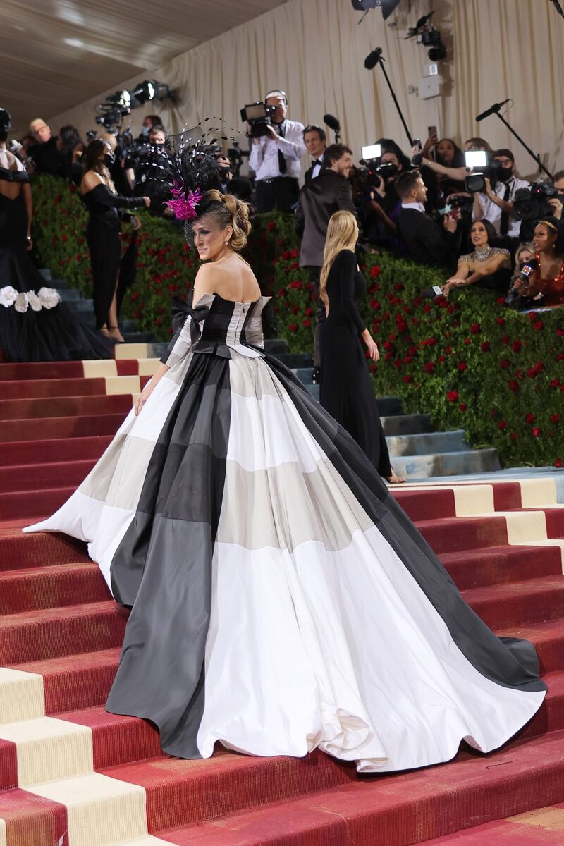 God, Sarah Jessica Parker is so refreshing. The huge bustle screams Gilded Age but the checkered pattern is thoroughly modern, and she tops off the Christopher John Rogers confection with a feathered hat that’d fit right in at the Vanderbilt Ball.
