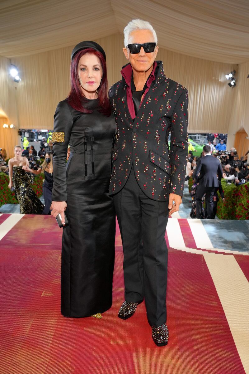 Pregnant with her second child, Game of Thrones alum Sophie Turner looks witchy and alluring in a beaded black long-sleeved Louis Vuitton gown. Joe Jonas, also in Louis Vuitton, looks like he’s doing B-Harry Styles cosplay.