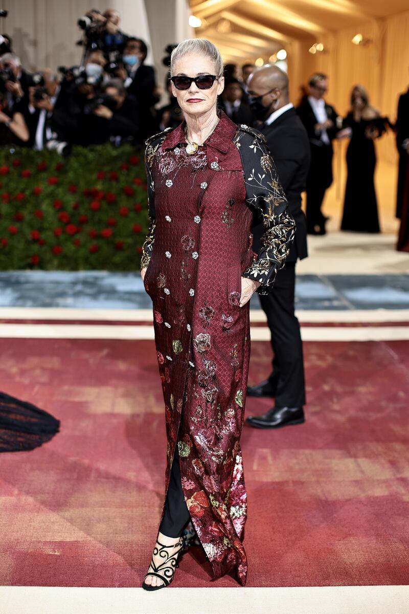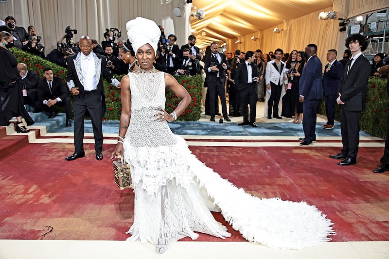 Carrying on her tradition of opting for stark black and white on the Met carpet, Janelle Monáe’s beaded gown by Ralph Lauren includes a head-hugging cap reminiscent of bathing beauty Esther Williams.