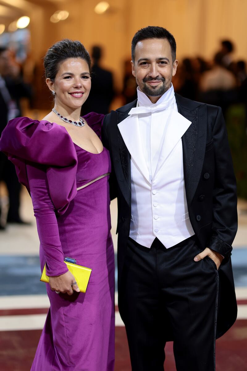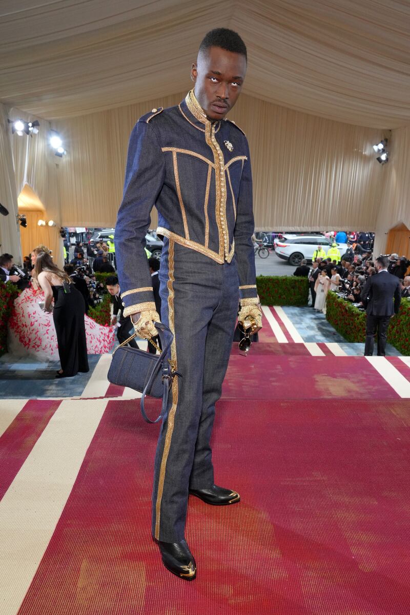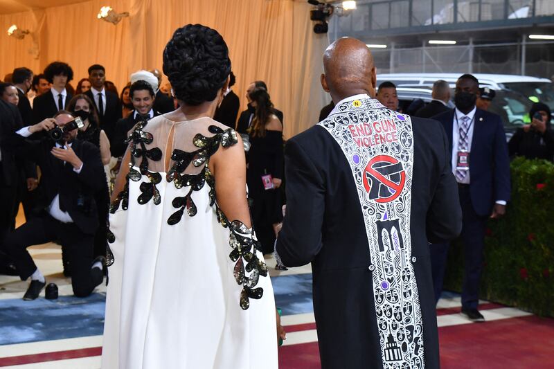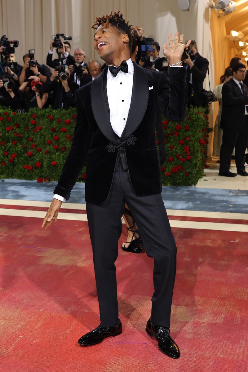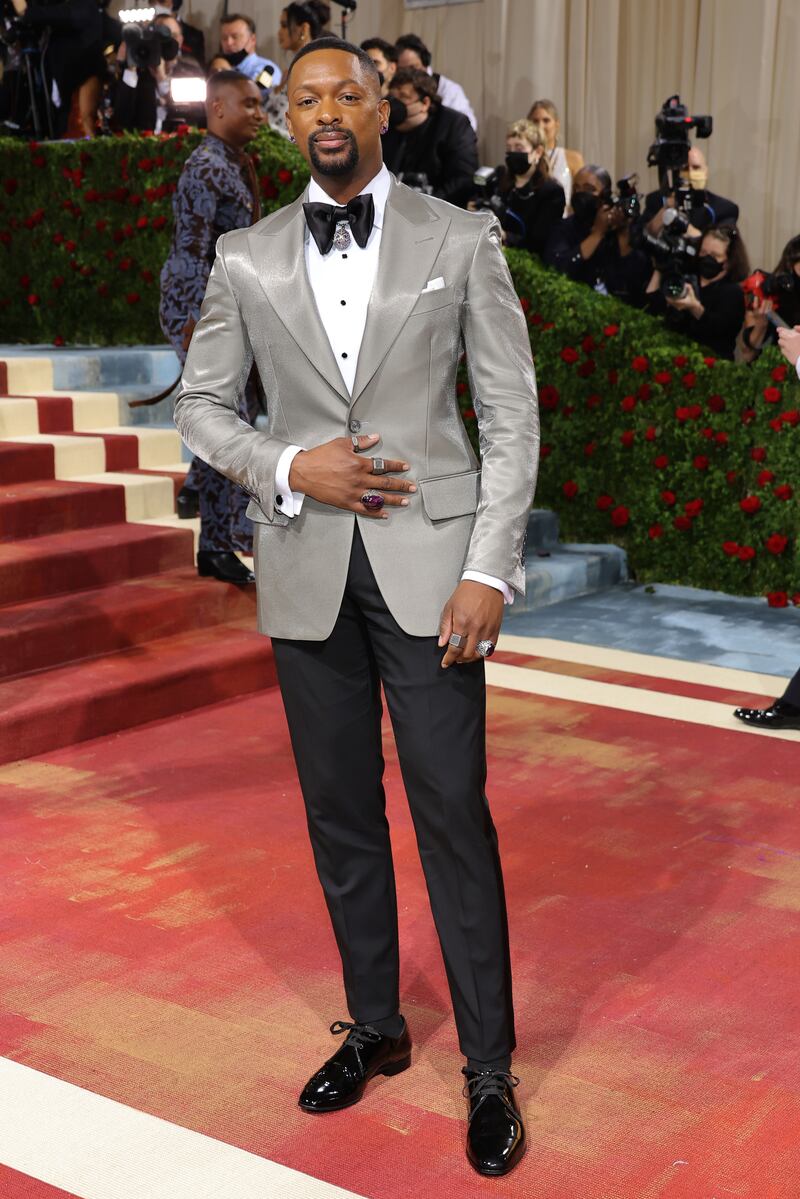Forgoing the Gilded Era-appropriate three-piece suit complete with tails that many other guys have been adopting, LaQuan Smith instead opted for a slick silver jacket and a bow tie complete with a bell; he also designed LaLa Anthony’s look.