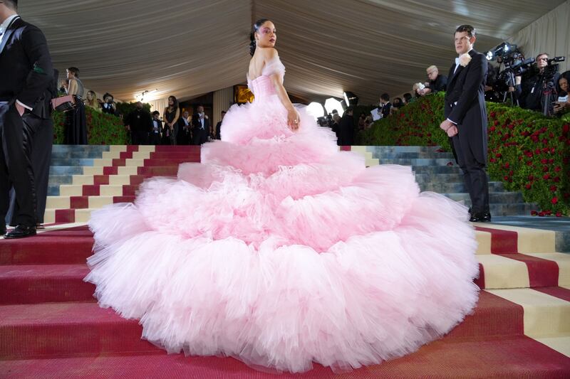 Tessa Thompson is bringing it in cotton candy pink tutu tulle by Carolina Herrera, accented with thigh high velvet pink boots.