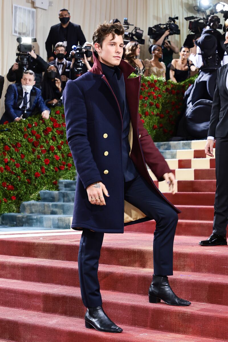Shawn Mendes rocks a red and navy double-breasted Tommy Hilfiger coat complete with gold buttons, looking every inch the suave courtier.