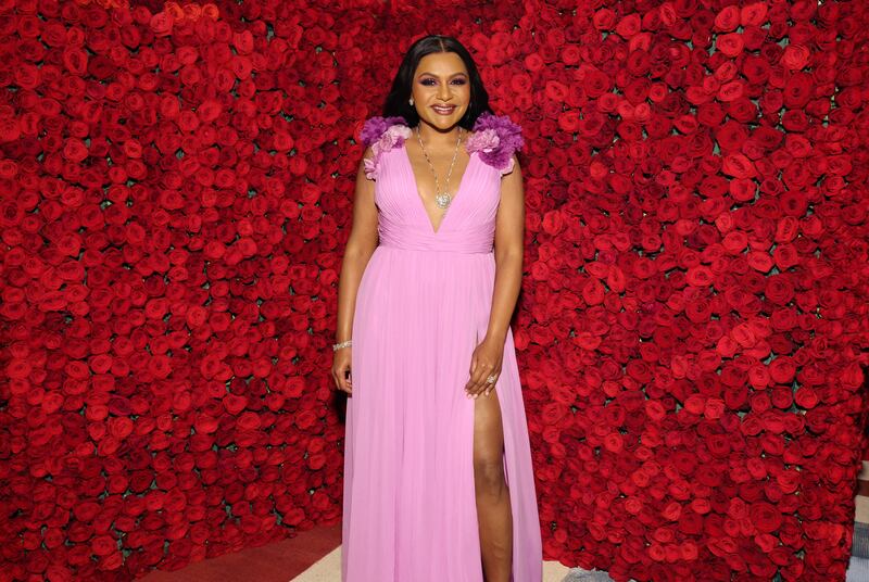 Blake Lively (with husband Ryan Reynolds) always looks best when she leans into the maximalist appeal of her crowd-pleasing beauty and golden blond hair, and this look is an early highlight. Halfway up the steps, assistants unfurled Lively’s blush rose Atelier Versace bustle to reveal a Tiffany blue train. Her opera gloves changed hues too. Bravissimo!